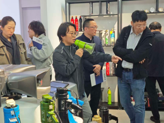 B 组则在产品部汪经理、李经理带领下走进产品区,智能头盔、无人救生艇、防水喊话器瞬间吸引目光 —— 有人轻握头盔感受轻量化设计,有人围在救生艇旁观察细节,有人拿起喊话器测试音质。
