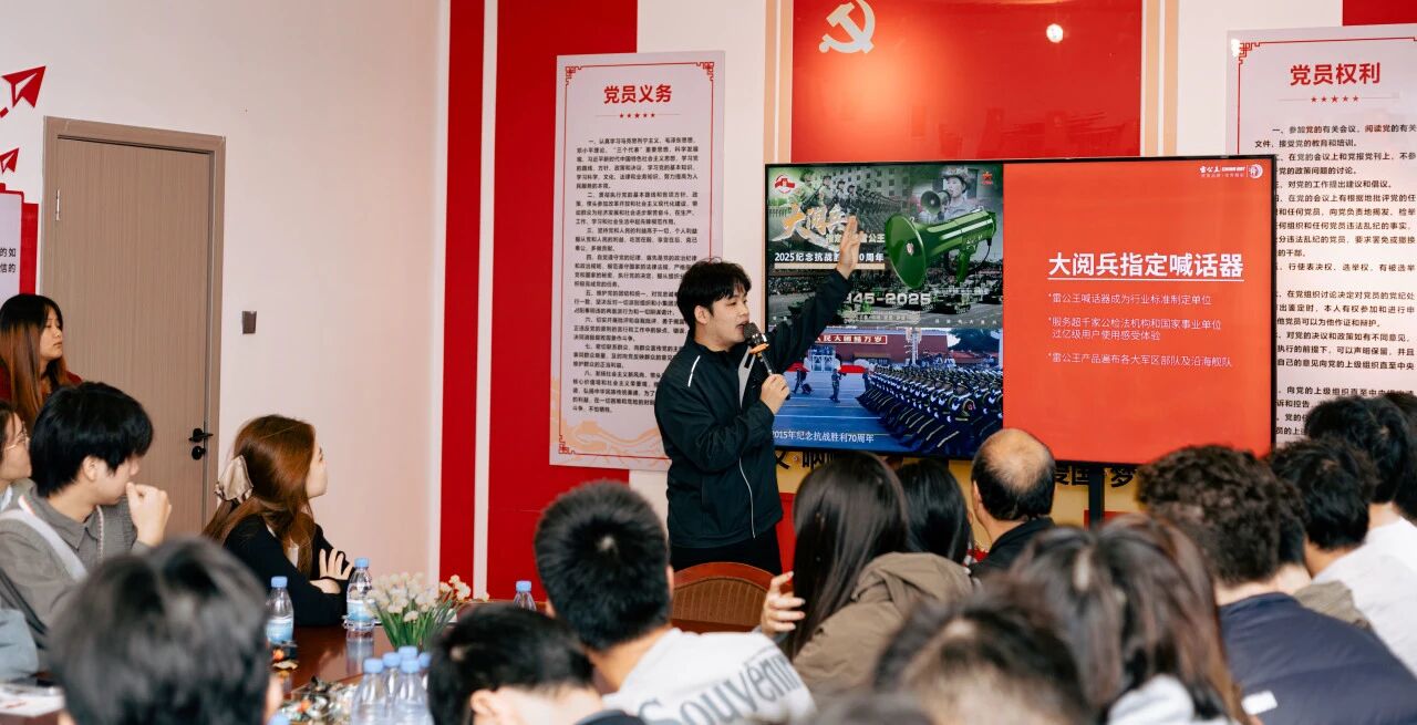 随后,大厚公司品宣部部长覃再励以五十余分钟分享,梳理雷公王的企业文化与发展历程:从早期专注生产喊话器,到如今构建 “海陆空三栖声防” 产品矩阵,警雷戰見智能头盔、海雷无人救生艇、天雷无人机喊话器;从创业初期确立 “大志尚远・厚德尚道” 理念,到多年来坚守 “产品就是人品” 的品质准则。每一段故事、一组数据,都藏着对 “正义” 的践行与对 “呐喊” 的诠释。