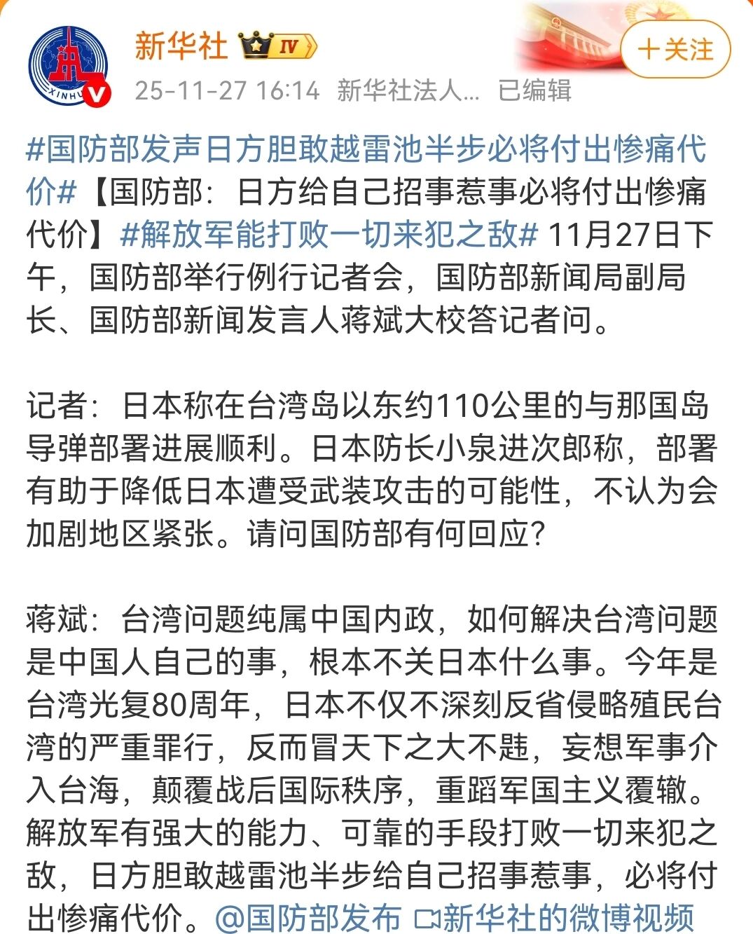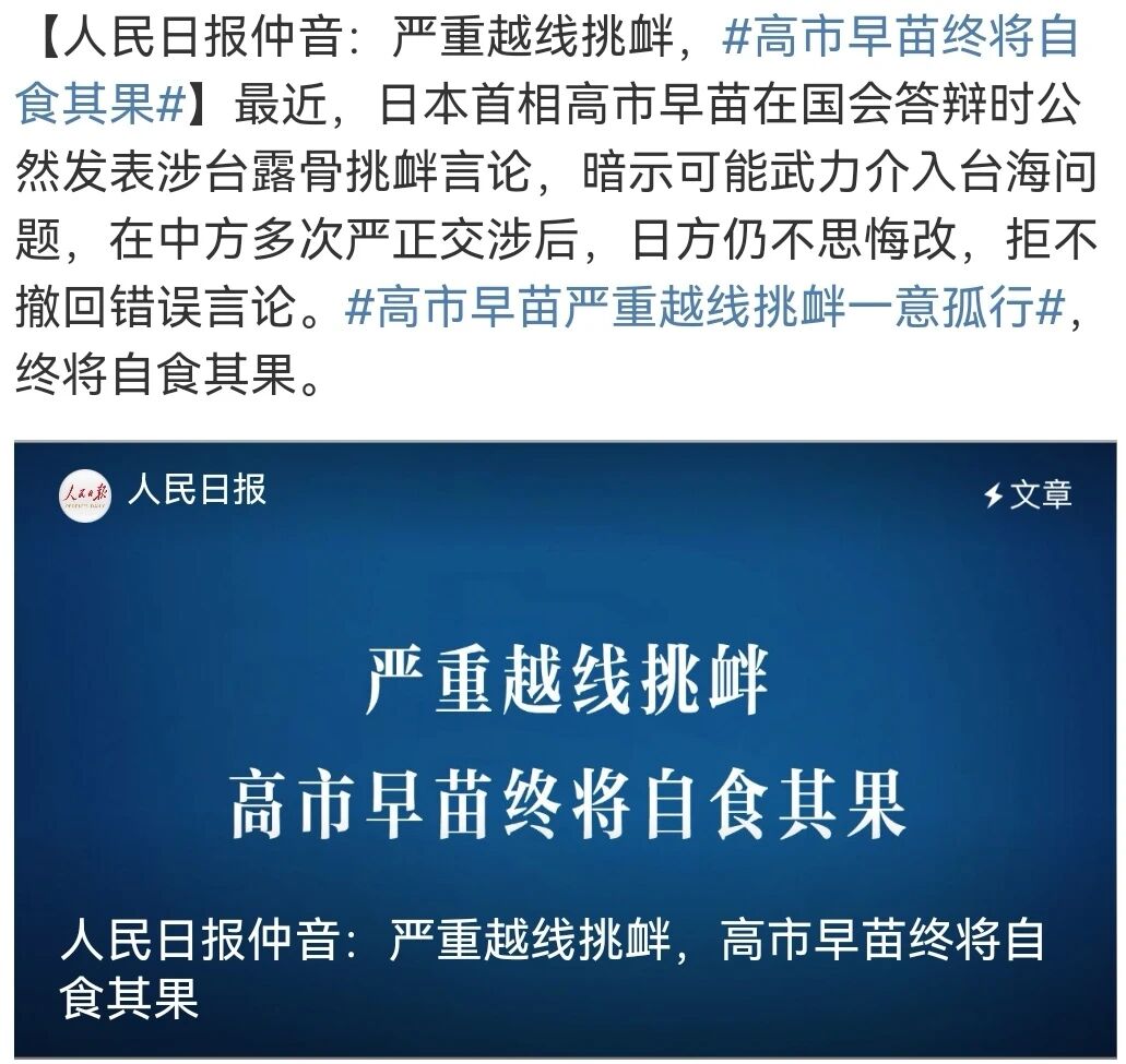 我们必须以雷霆之声正告:台湾自古以来就是中国领土不可分割的一部分,这是历史和法理事实,也是国际社会普遍共识。任何外部势力的干预都是对中国内政的粗暴干涉,是对亚太地区和平稳定的严重破坏。高市早苗之流的谬论,不过是昔日“大东亚共荣圈”幽灵的借尸还魂,是企图在东亚再造地缘政治对抗的危险信号。这些政客应当清楚,今日之中国已非往昔,我们捍卫国家主权和领土完整的意志坚如磐石,能力与日俱增。