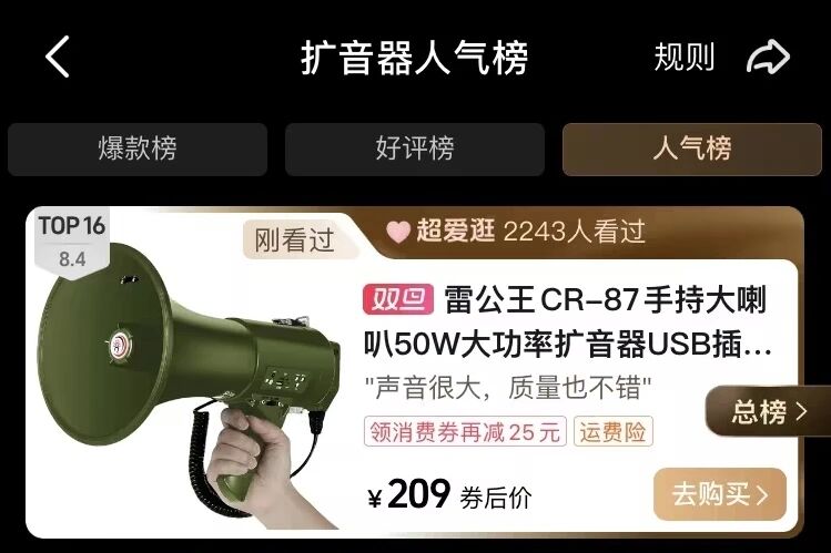 作为新媒体运营工作的带头人,他始终秉持实干精神与创新思维,带领团队深入钻研平台运营规律、精准把握用户需求导向,从店铺基础搭建、品牌形象塑造到内容策划传播、服务体验优化,每一项工作都精益求精、一丝不苟。正是这样的拼搏劲头,让雷公王旗下产品得以脱颖而出 ——CR-87 凭借卓越的音质表现与实用性能,成功登上抖音扩音器人气榜前列;CR-67、CR-666 两款明星产品更是凭借过硬品质与市场口碑,强势跻身抖音扩音器年终好物榜,用实打实的榜单成绩证明了产品的核心竞争力,也为雷公王品牌在抖音平台的扎根生长奠定了坚实基础,充分展现了大厚青年敢闯敢创、踏实肯干的优良作风。