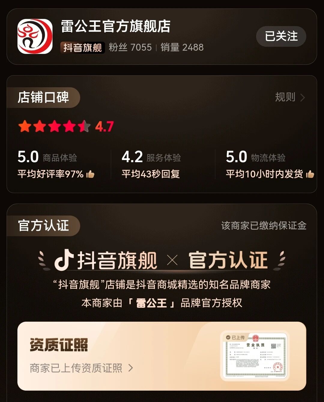 黑标旗舰店作为抖音平台的最高级别店铺资质,是对品牌综合实力、运营能力、服务水平和市场影响力的高度认可。此次荣升,不仅标志着雷公王品牌在抖音电商生态中的地位得到显著提升,更实现了从“平台入驻”到“行业引领”、从“规范经营”到“标杆示范”的关键跨越,成为影音领域新媒体运营的典范之作。这一次次的升级跨越,既是品牌实力持续增强的生动体现,也是团队奋斗成果的有力见证,更是大厚电子长期主义品牌战略的显著成效。