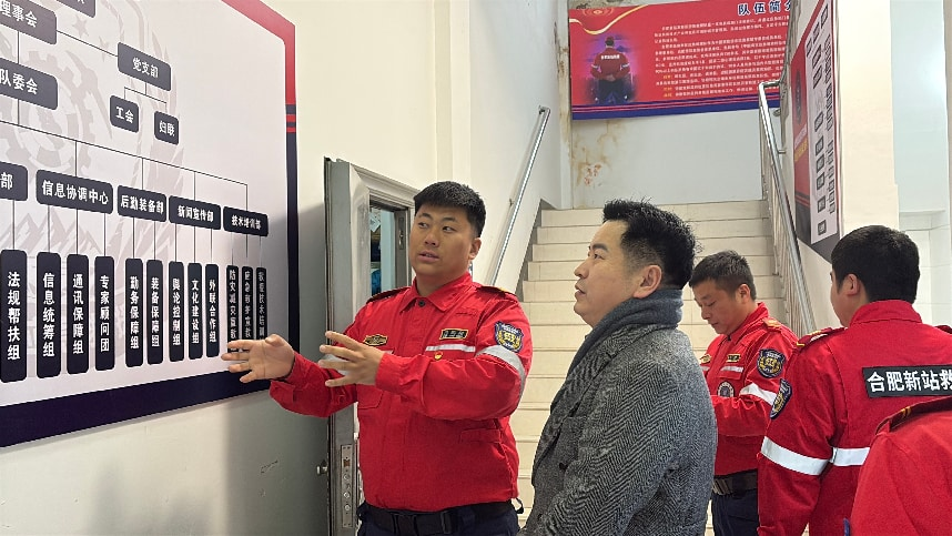 捐赠仪式当天,合肥大厚科技企业代表一行来到救援队。仪式开始前,在应急救援队队长陈鹏翔的带领下,大家实地参观了办公区、装备库及训练场地,详细了解队伍建设、日常训练流程与应急响应工作机制,近距离感受一线救援人员的专业素养与坚守精神。