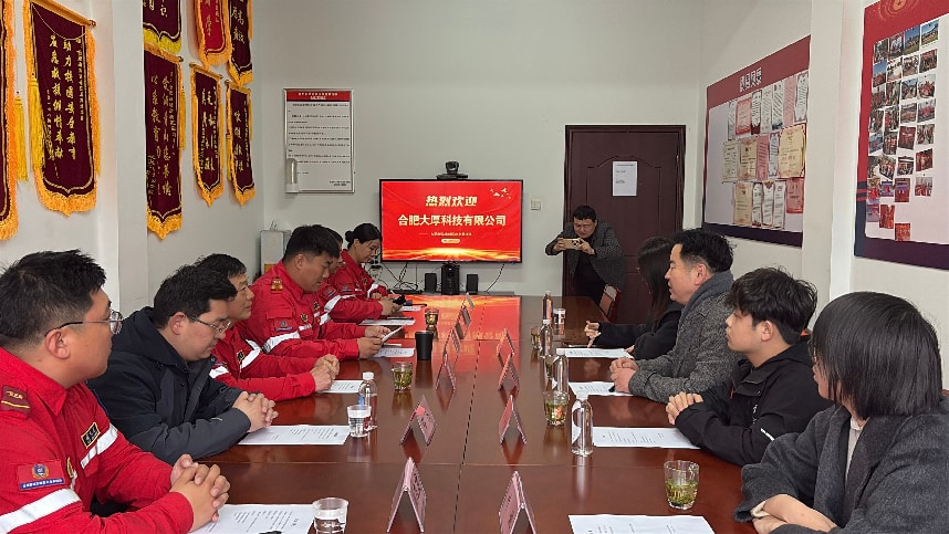 仪式开始前,合肥大厚科技代表在陈大队长的带领下,实地参观了应急救援队办公区、装备库及训练场地,详细了解队伍建设、日常训练流程与应急响应工作机制,近距离感受一线救援人员的专业素养与坚守精神。交流中,大厚科技代表向在场领导及队员介绍了企业发展历程、核心技术优势及在应急安防领域的深耕成果,重点讲解了雷公王系列产品在各类应急救援场景中的应用价值,双方就应急装备使用、技术升级及后续协作等话题展开深入探讨,凝聚起政企协同助力应急管理事业发展的共识。