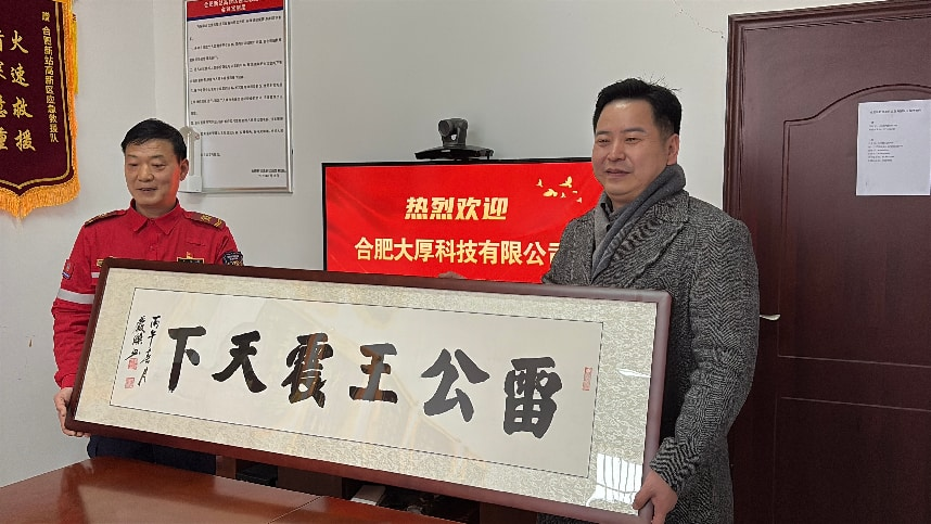 合肥大厚科技董事长金总出席活动并发表讲话,介绍了企业发展理念与文化初心,表达了守护万家灯火的企业愿景。金总表示,此次捐赠是大厚科技践行社会责任、彰显企业担当的具体行动。公司始终深耕应急安防领域,以专业产品与技术实力服务社会、守护民生。未来,大厚科技将继续发挥自身产品与技术优势,全力加强与新站应急救援队的深度合作与互动学习,在装备应用、应急保障、实战协同等方面深化交流,共同提升区域应急救援能力与安全防护水平。公司也将以更扎实的行动回馈社会,持续践行 “雷公王安天下·万家灯火皆与你我有关”的企业愿景。愿大厚科技与新站应急救援大队双方携手共进,共筑安全防线,守护一方平安。